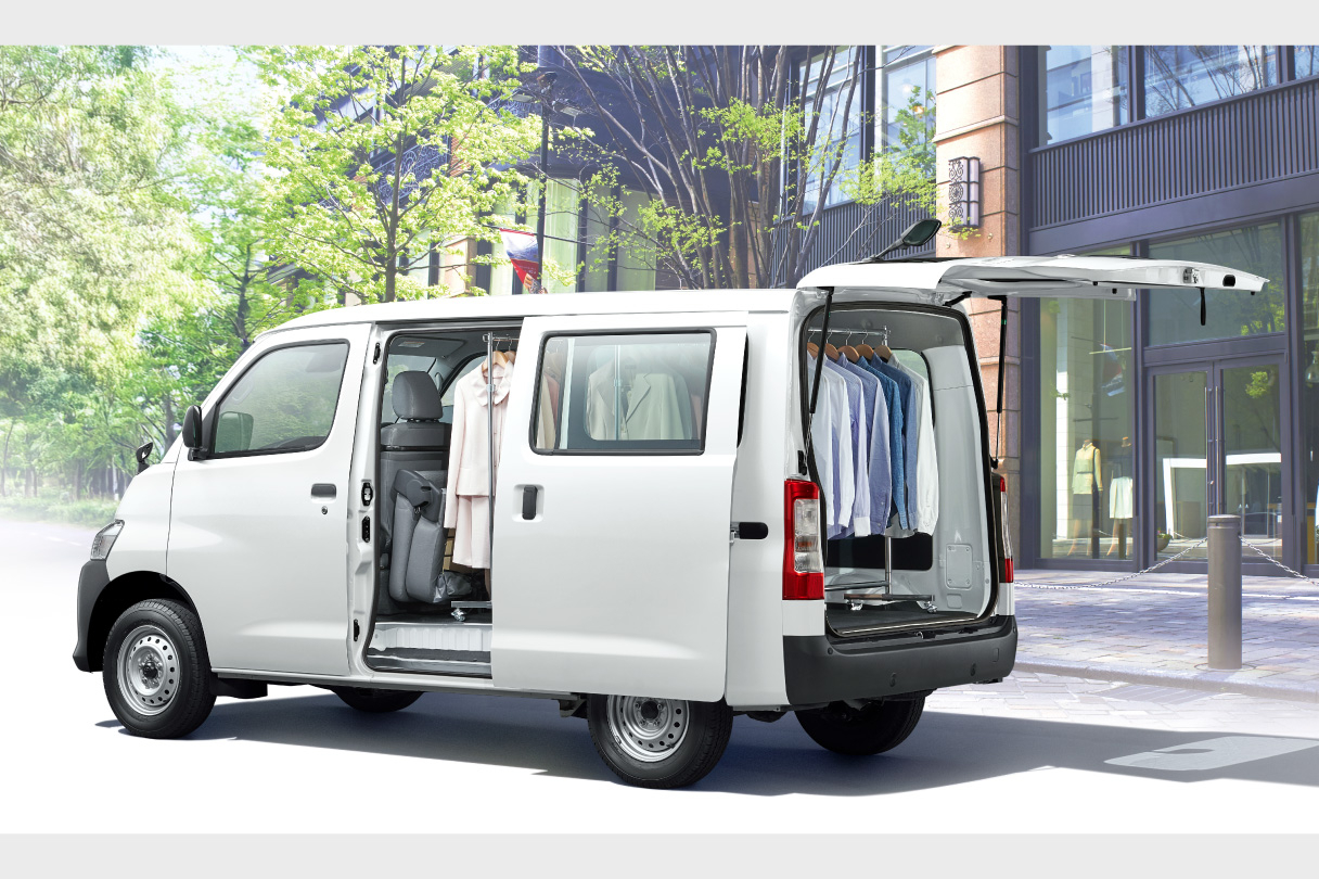 コンパクトなボディ寸法から想像を超える広い室内空間。 スクエアなパッケージ設計で、荷室もキャビンもゆとりの広さ。 ワイドな開口部の両側スライドドアと、大きく開くバックドアで荷物の積み下ろしも快適です。