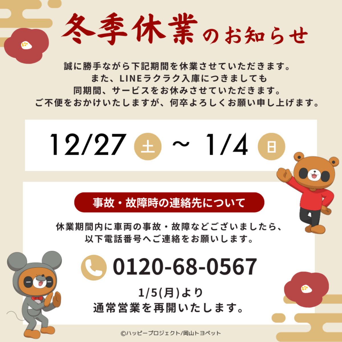 誠に勝手ながら12月27日(土)〜1月4日(日)を休業させていただきます。